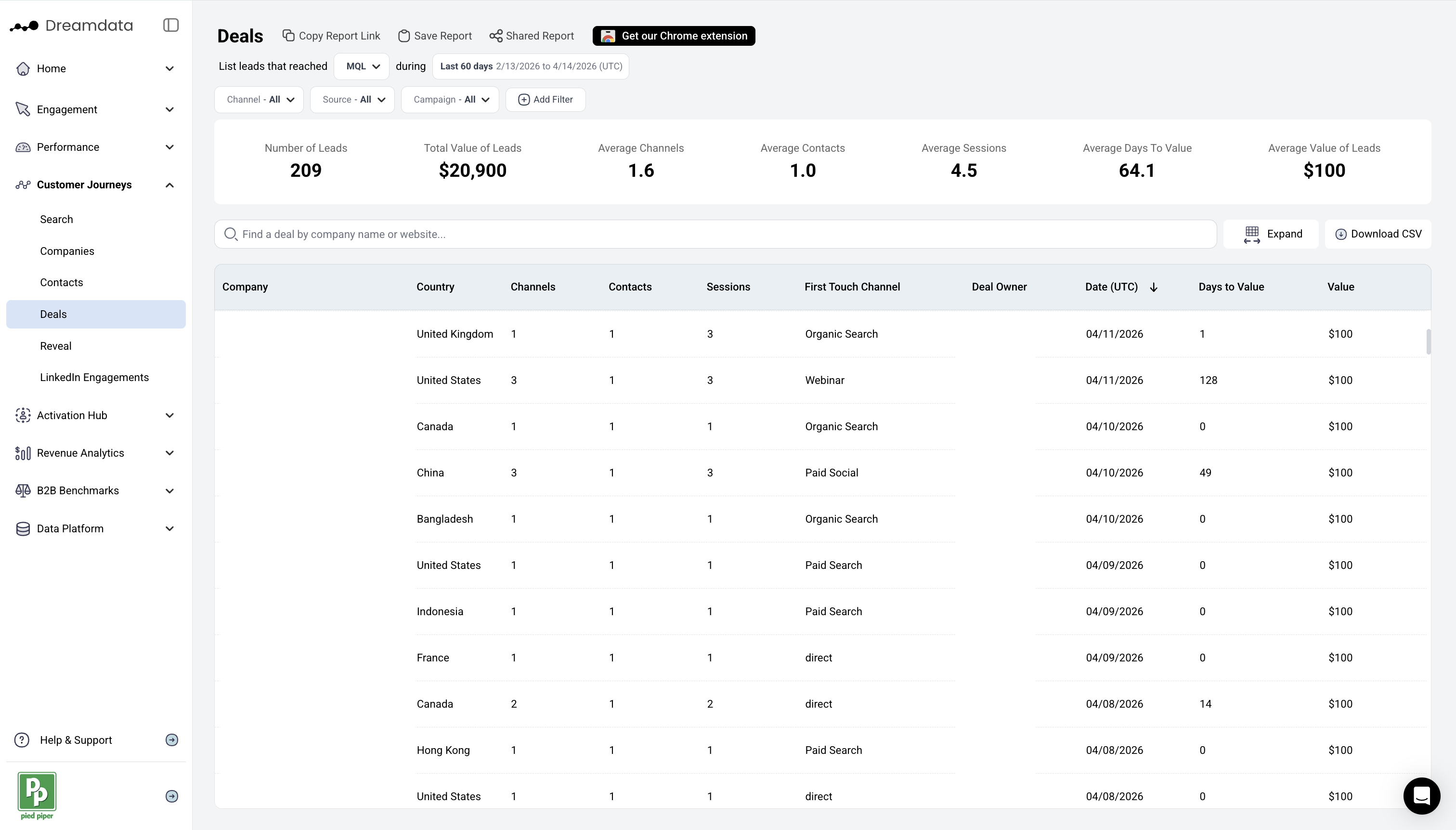 This dashboard will allow you to look at each individual deal and understand what were the touches that led up to the conversion. It will also give you an overview of all your deals combined. Collected data is assigned to each account that has been identified during cross-device tracking.