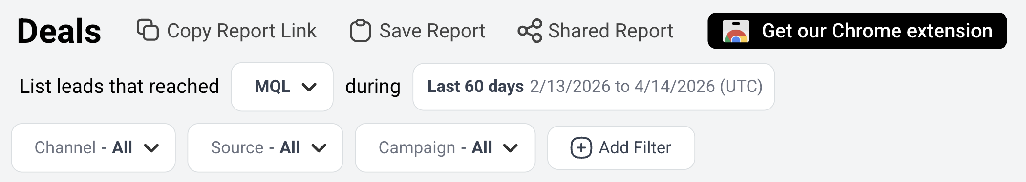 Channels, Sources, Campaigns & Other filters: These filters allow you to hone in on specific marketing efforts. Analyze specific channels, sources, or campaigns to understand their impact and contribution to the deals.