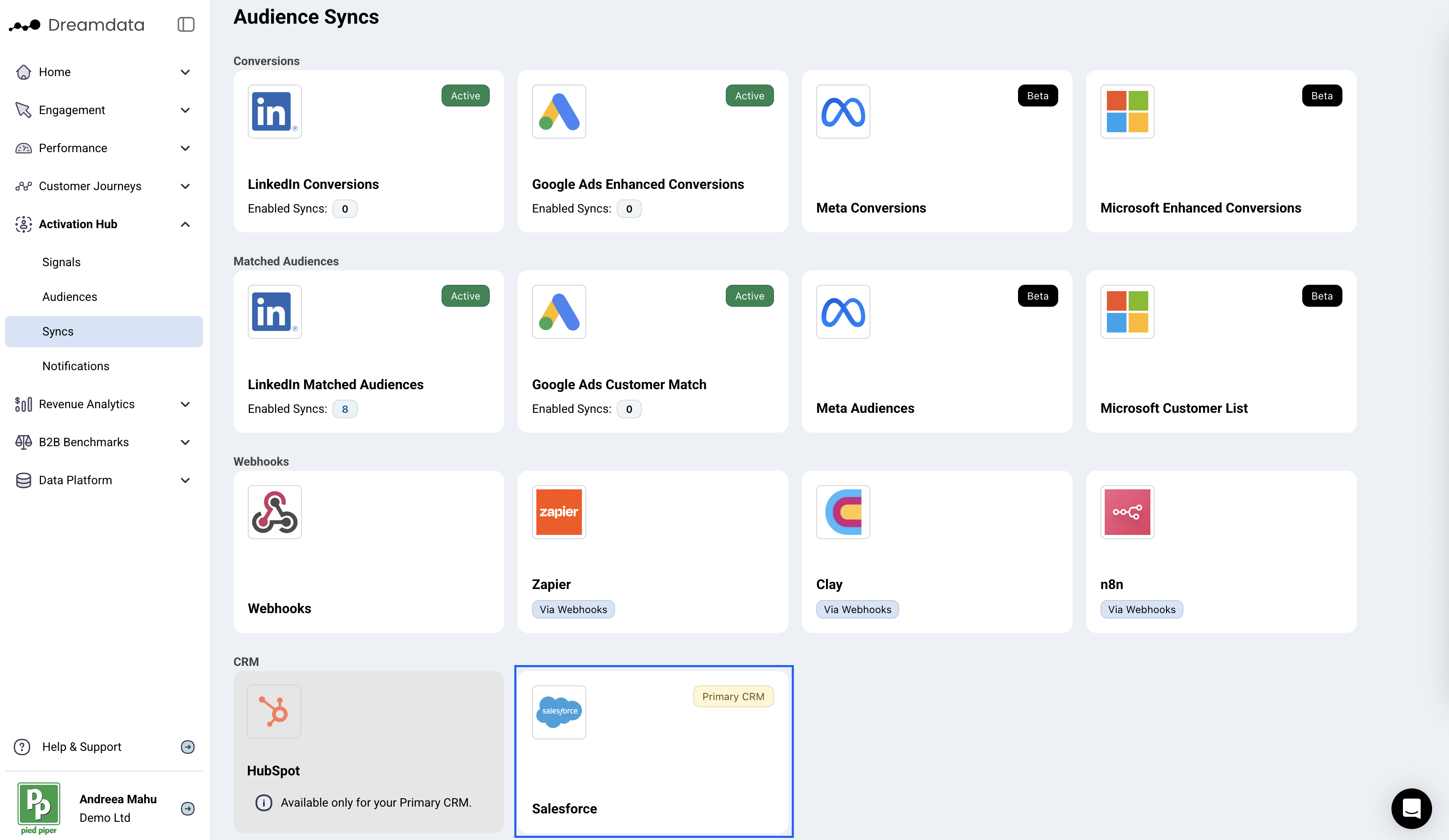 On Dreamdata's main menu, navigate to Activation Hub -> Syncs and select Salesforce from the CRM section.