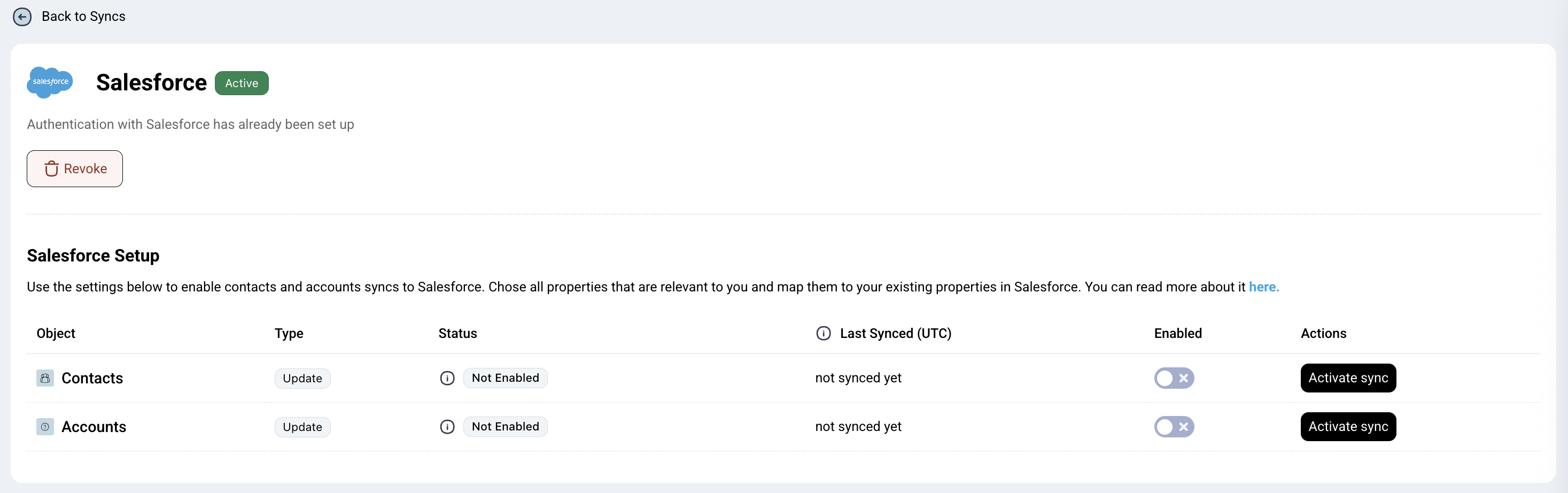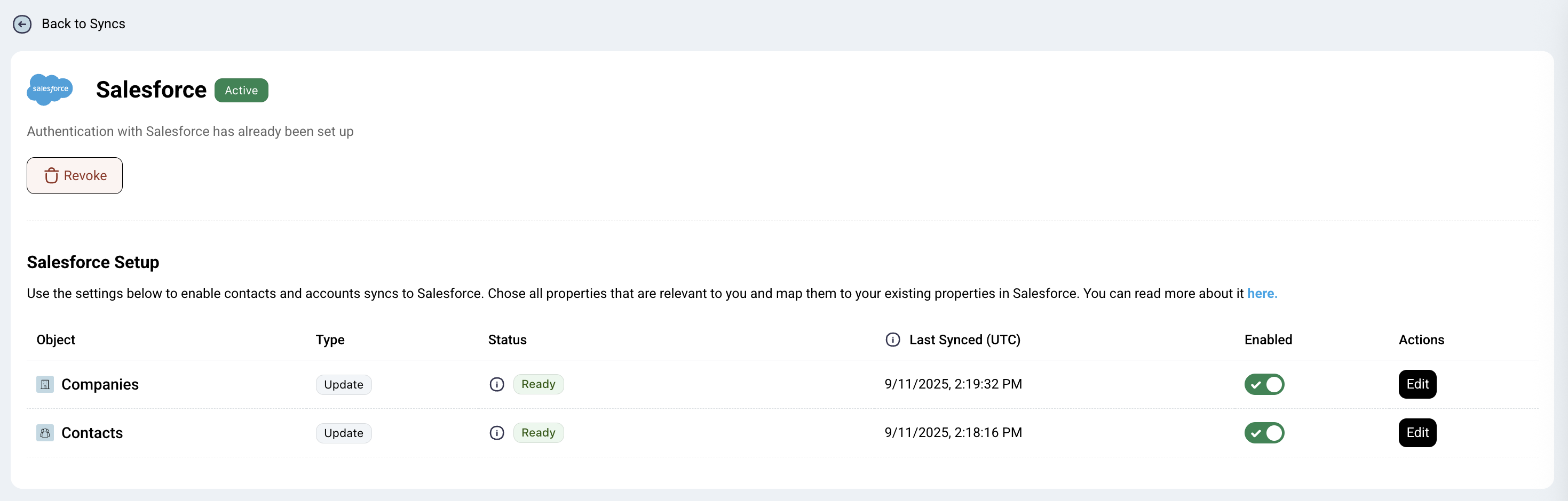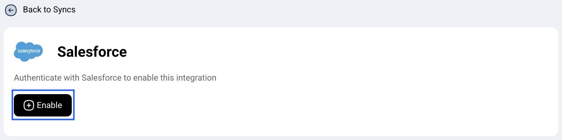 Click the Enable button to connect your Salesforce account. Make sure that the account used has access to edit the relevant properties.