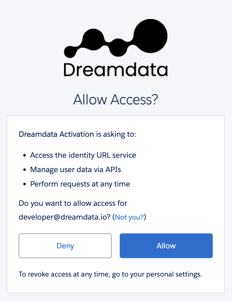 If you aren't already signed in, sign into your Salesforce account. Make sure you have the “Approve Uninstalled Connected Apps” and "API Enabled" administrative permissions enabled for your profile. You'll be asked to allow access to Dreamdata Activation. Click "Allow".