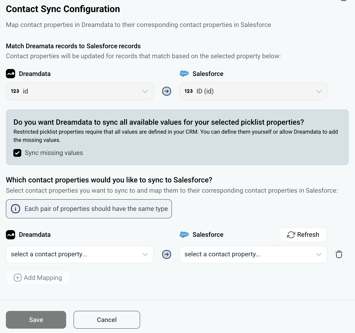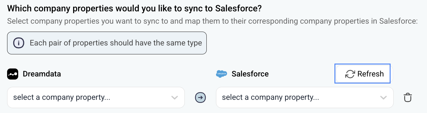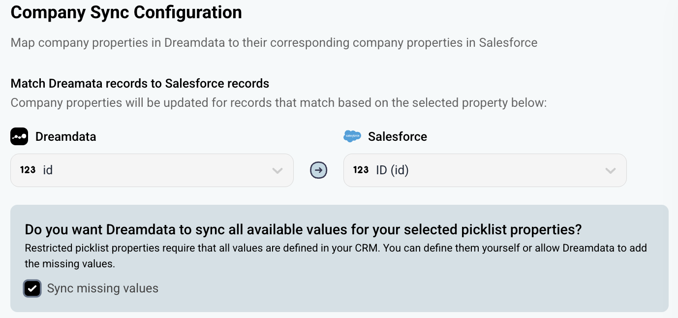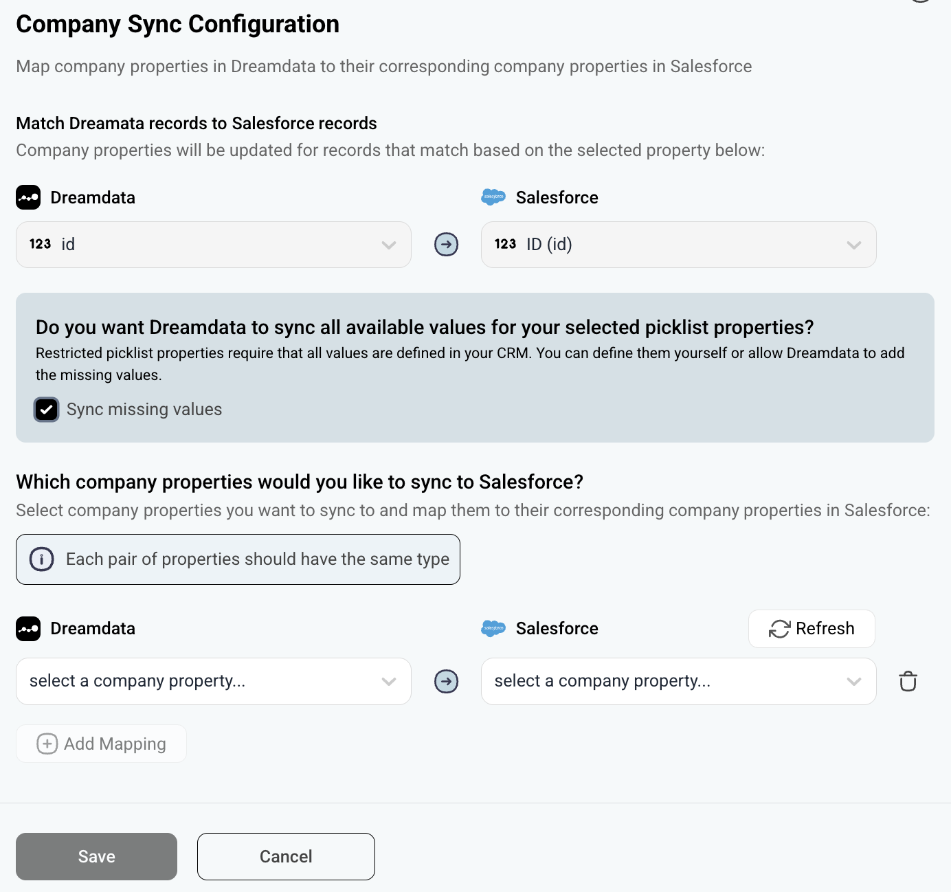Enable the Sync missing values checkbox available in your configuration if you want to allows Dreamdata to sync all available values into your selected restricted pick-list properties (this is required for each sync). This removes the setup work needed in your CRM to define all accepted options. If you do not want to check the Sync missing values checkbox, make sure that the values defined in Dreamdata are also added in Salesforce for each pick-list property (example: all individual signal names have to be defined in Salesforce for the property that will be used to sync signals into, if it's defined as a restricted pick-list). Unrestricted pick-lists do not have this limitation.If you add or update properties while doing the configuration in Dreamdata, click the refresh button to pull the latest information from Salesforce.