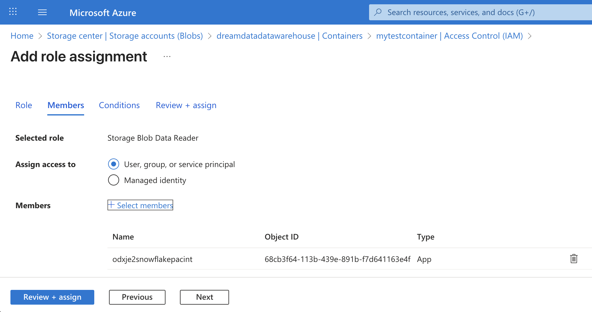 - Next, Snowflake's Service Principal needs to be given access to your Azure Storage Container. To do so, in Microsoft Azure Portal, follow these steps: