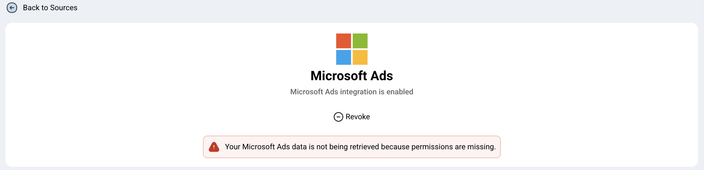 Your Microsoft Ads data is not being retrieved because permissions are missing. | We are unable to pull Microsoft Ads data from the enabled ad accounts because the permissions required are missing from the user used to enable the integration. The user needs one of the following roles with access to the needed accounts: Super Admin, Standard User, Advertiser Campaign Manager or Viewer |