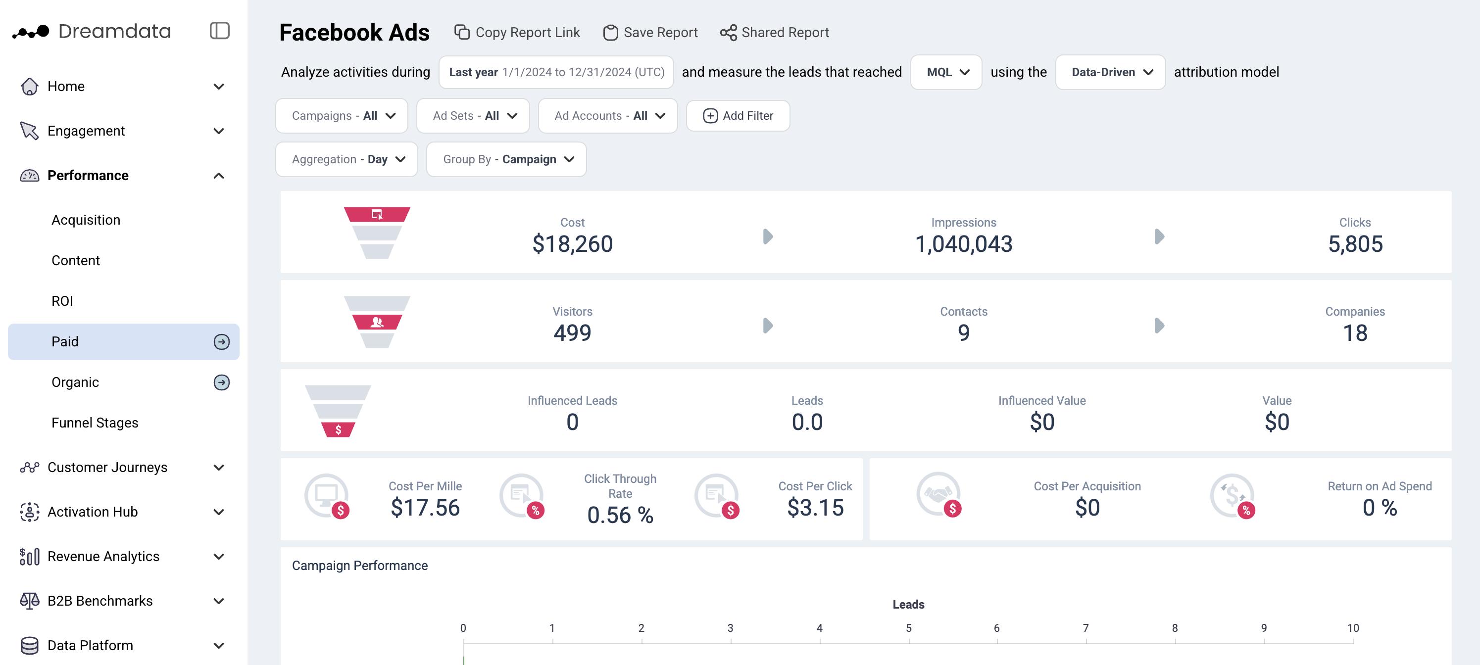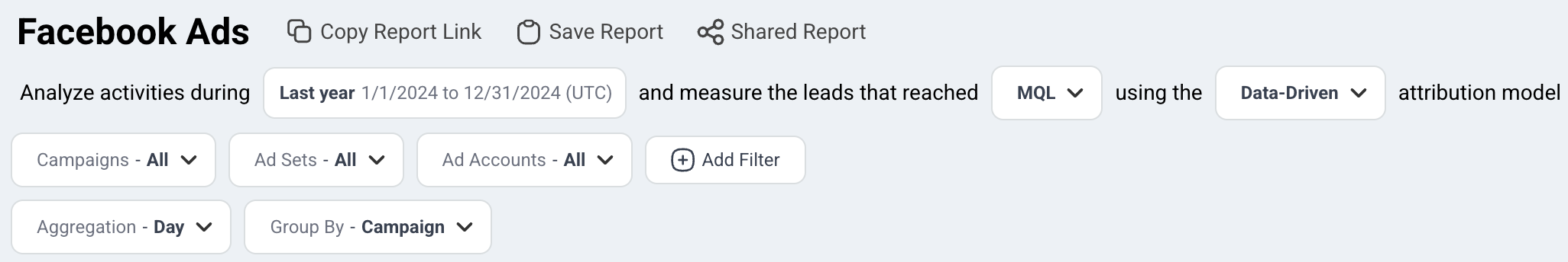 Remaining metrics: Leads and Value are attributable metrics, they display Facebook Ads performance data based on the filters selected.