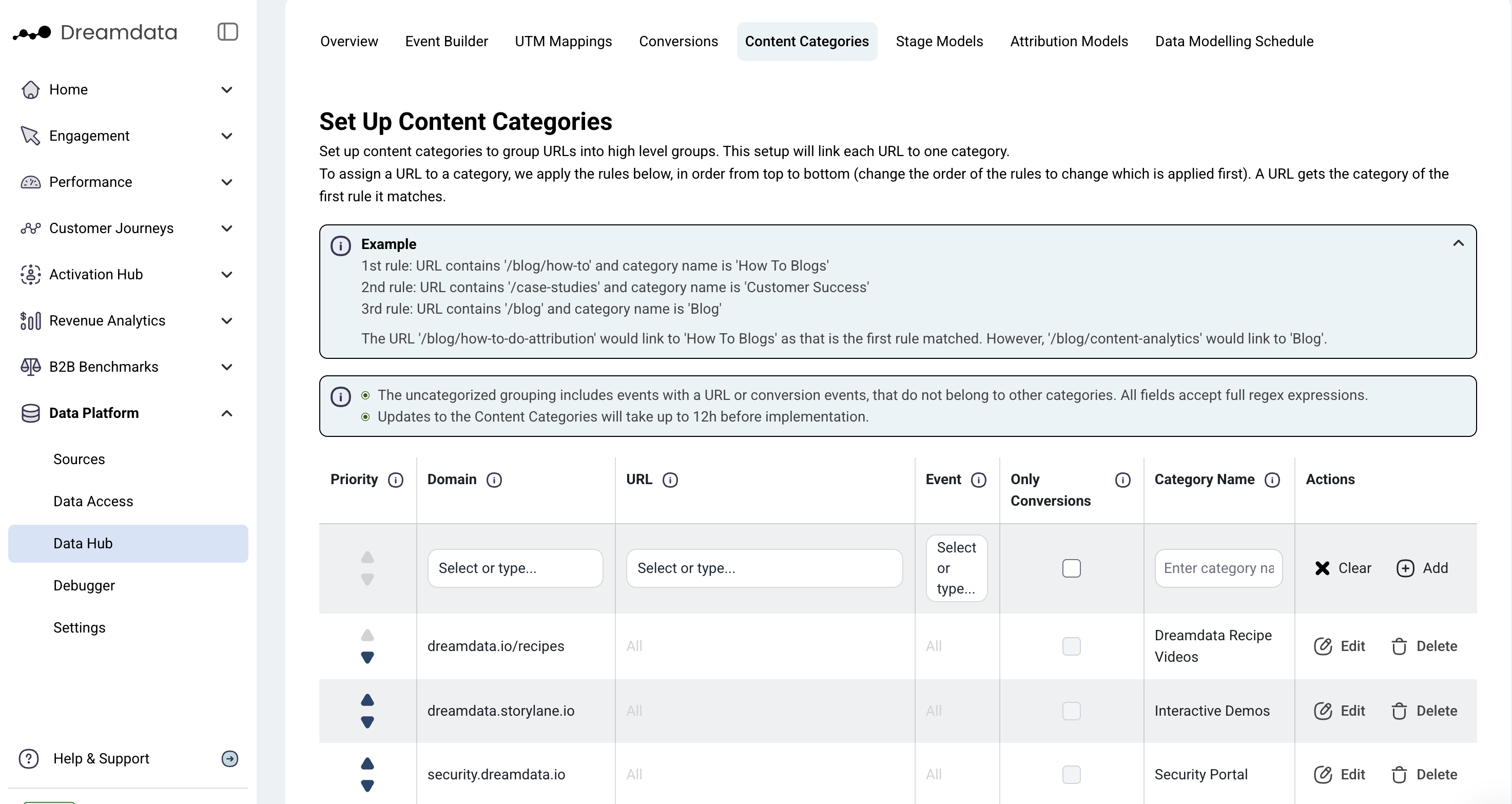 Content Categories are based on filters applied to domain, URL, or event. In addition, we can use the 'Only Conversions' checkbox to include only events that are setup as conversions within the Dreamdata Platform.