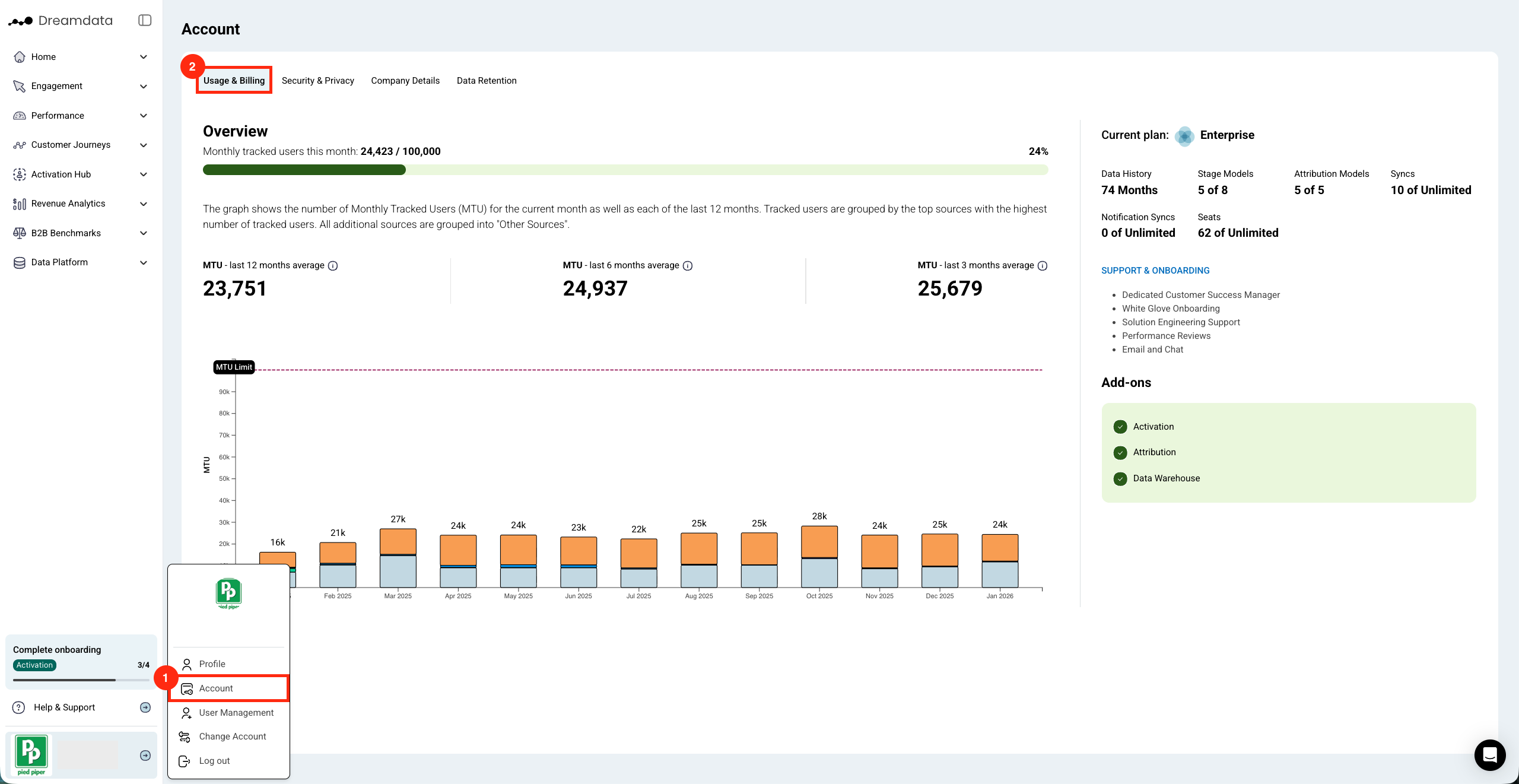 MTU numbers can be found under Account -> Usage & Billing dashboard on your Dreamdata dashboard.