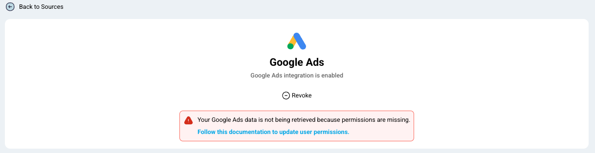 Your Google Ads data is not being retrieved because permissions are missing | We are unable to pull Google Ads data from the enabled ad accounts because the permissions required are missing from the user used to enable the integration. The user needs one of the following roles with access to the needed accounts: Admin, Standard or Read only. |