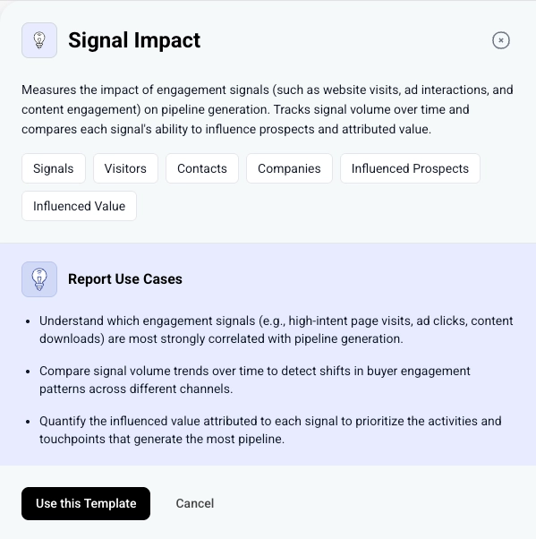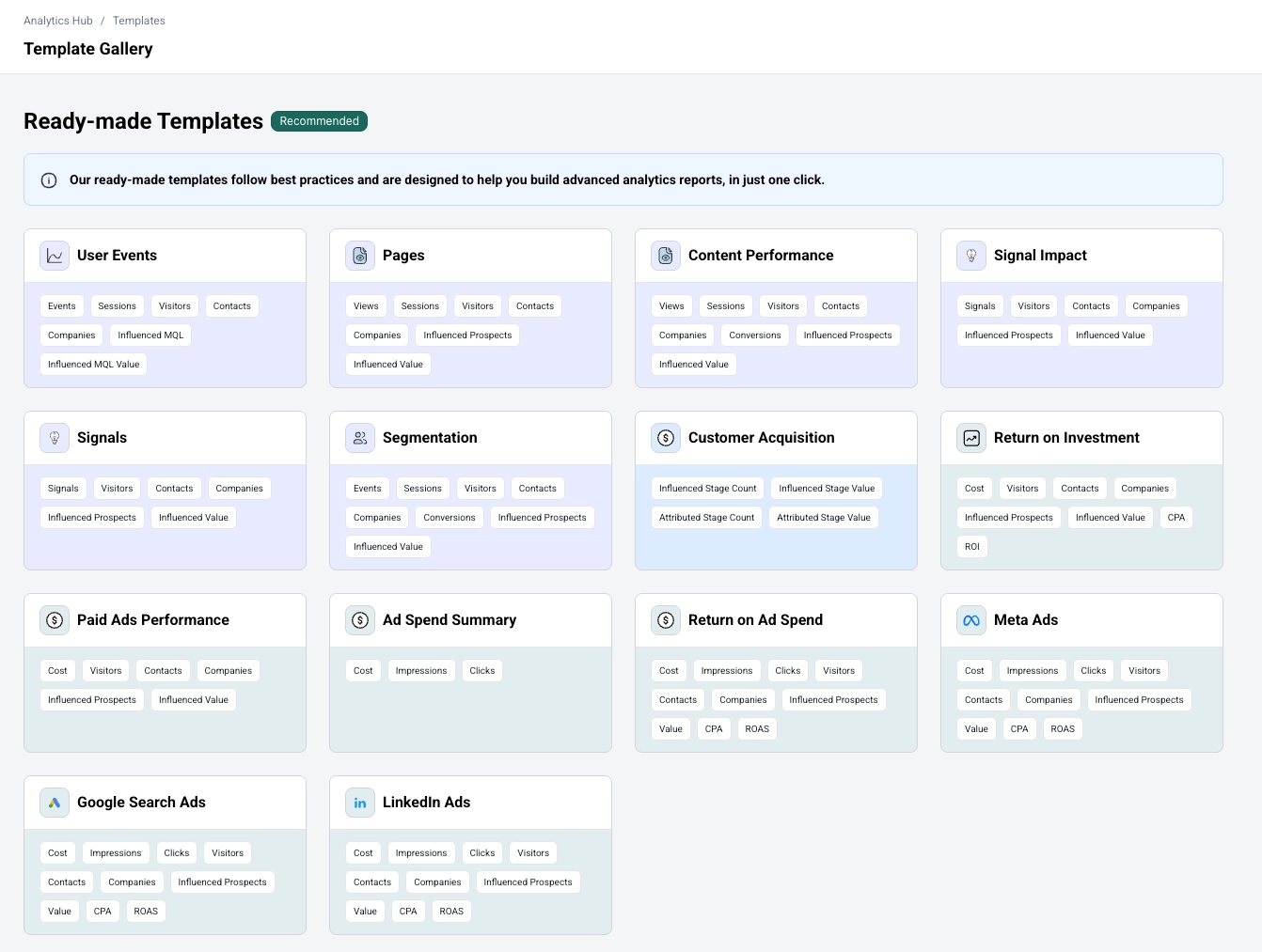 - Metric tags — The metrics included in the template (e.g., Cost, Visitors, Contacts, Companies)