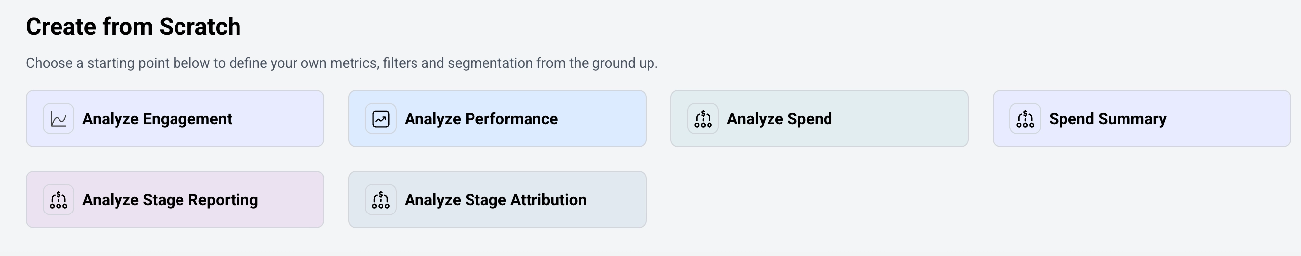 Templates are pre-built report configurations that help you get started quickly. Each template pre-populates the configurator with metrics, filters, and settings that address a common use case so you can generate a meaningful report in just a few clicks.