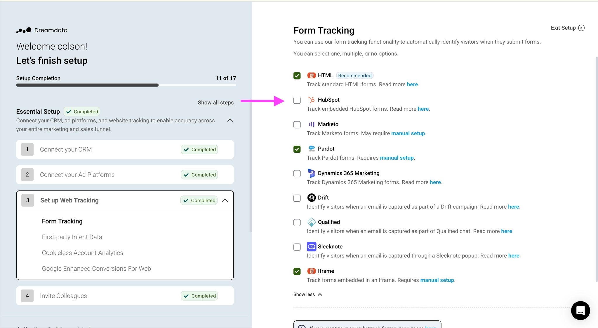 Most forms can be captured with the previously generated tracking script created in Data Platform -> Sources -> Javascript v2.0. For forms with iframes or calendar forms, refer to the linked Developer Guide. If you're using embedded HubSpot forms, make sure to include them during the tracking script generation step above.