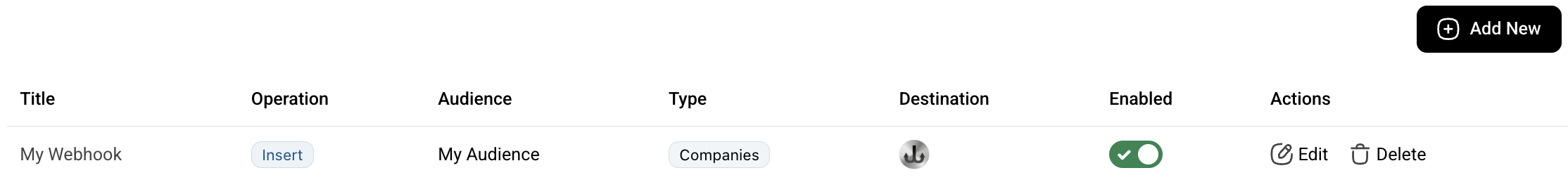 You will be able to see a list with all your saved Webhook syncs and some properties:In this view, you can disable, enable, edit and delete syncs.