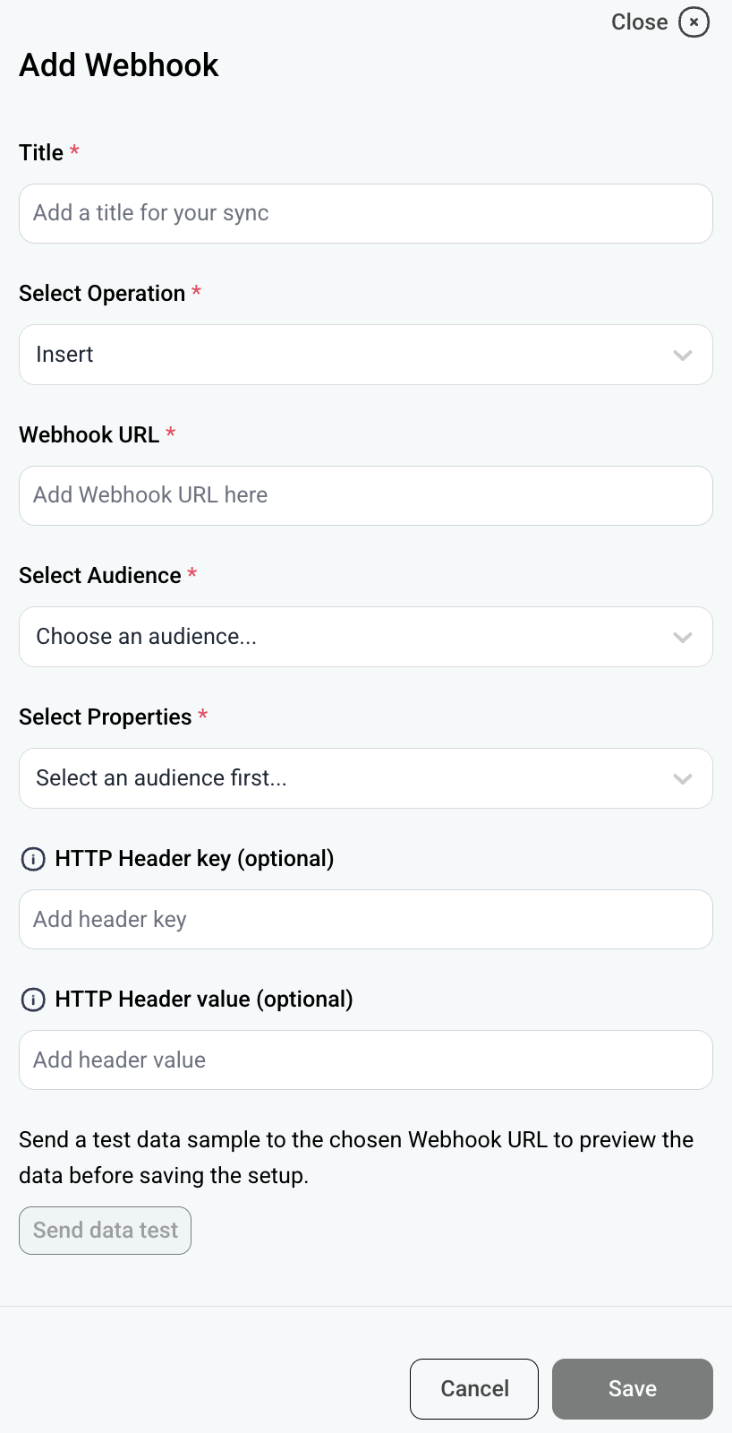 Choose a title for your sync and desired operation, Insert or Upsert. After the initial sync which includes all existing records, Insert will only sync new contacts/companies. Upsert will also continuously sync all property updates for all contacts/companies. Add the URL for the Webhook you want to use and select the audience (companies or contacts) that you want to sync. Click Save after you filled in the configuration (depending on your setup, you may need to use the HTTP header fields as well).