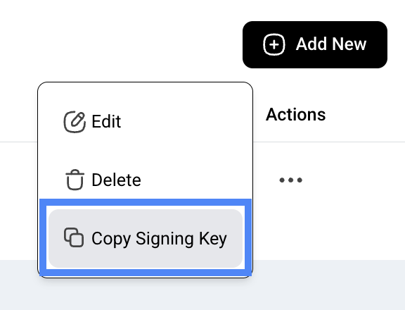 Use your secret signing key: You can find your signing key under the actions menu for each webhook sync created.