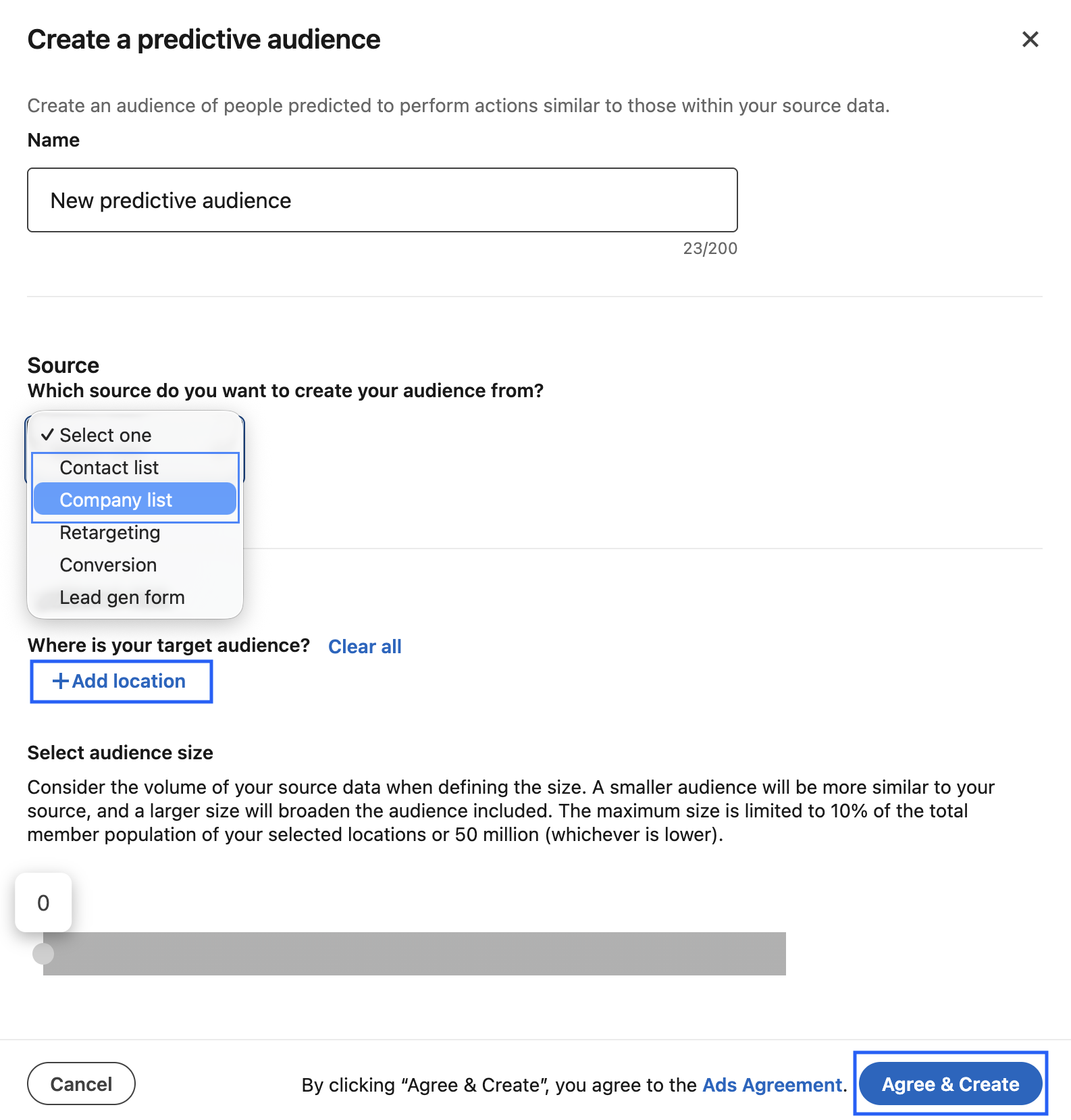 Select a company or contact audience that you synced to LinkedIn already through Dreamdata syncs for Matched Audiences. Add a location and click Agree&Create to save your new Predictive audience.