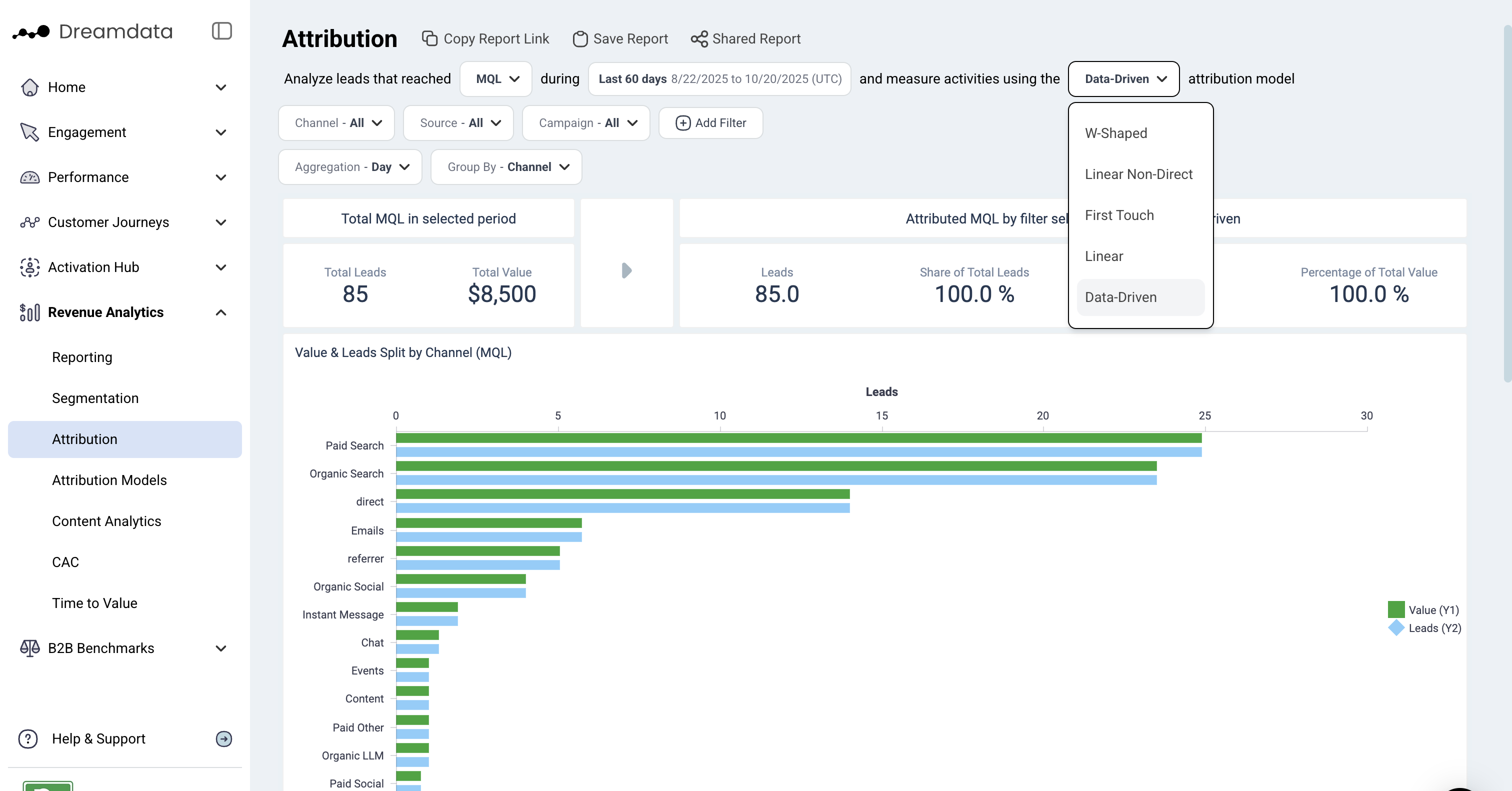 There are several different attribution models but at Dreamdata we provide you with the top 6 which are: First and Last-touch, Linear, W-shaped, U-shaped and our newest Data- Driven attribution model. Each attribution model distributes a certain amount of credit (in%) of a conversion across each touchpoint.