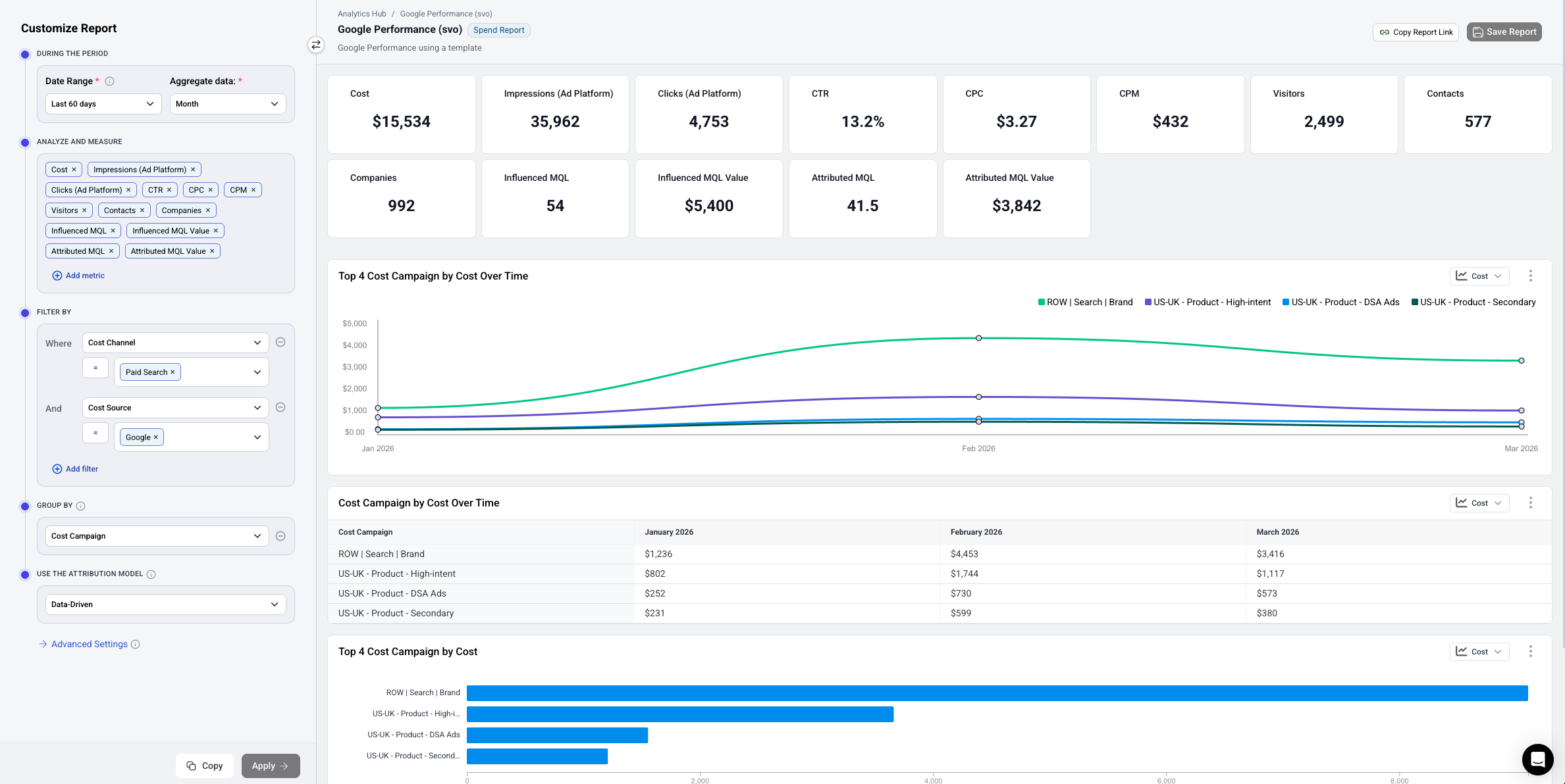 A report is the starting point for analyzing marketing data in Dreamdata Analytics Hub. You build a report by choosing the type of report, what to measure, how to group it, and which time period to look at. Once configured, the report generates a set of widgets — metric cards, graphs, and tables — that summarize and visualize your data.