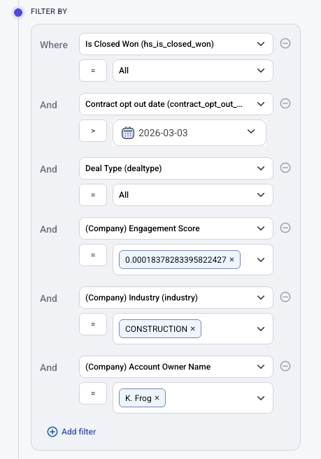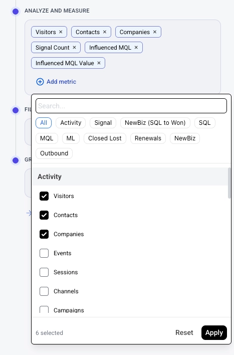 - In the Analyze and Measure section, you'll see your currently selected metrics as tags (e.g., Visitors, Contacts, Companies).