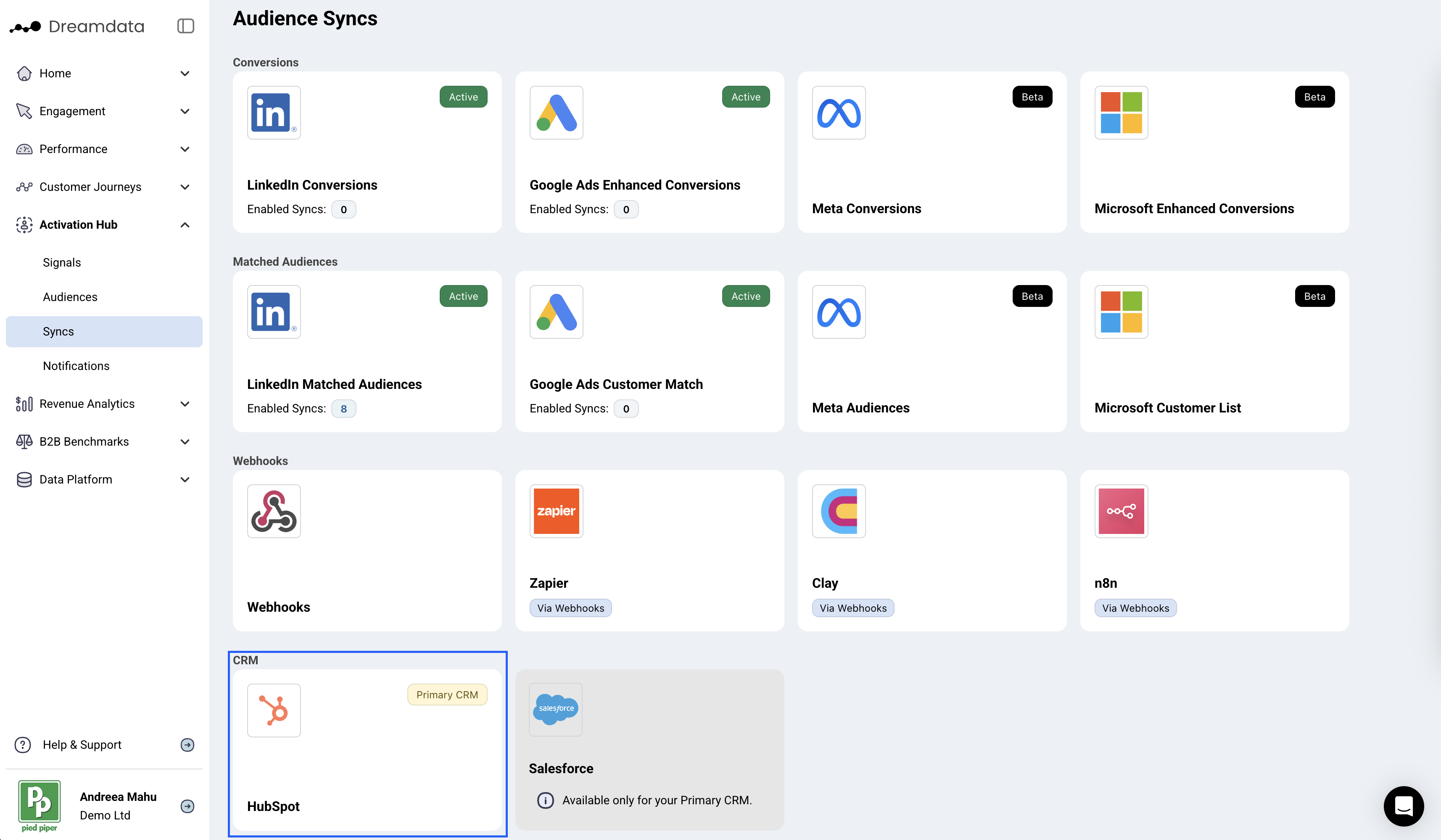 On Dreamdata's main menu, navigate to Activation Hub -> Syncs and select HubSpot from the CRM section.