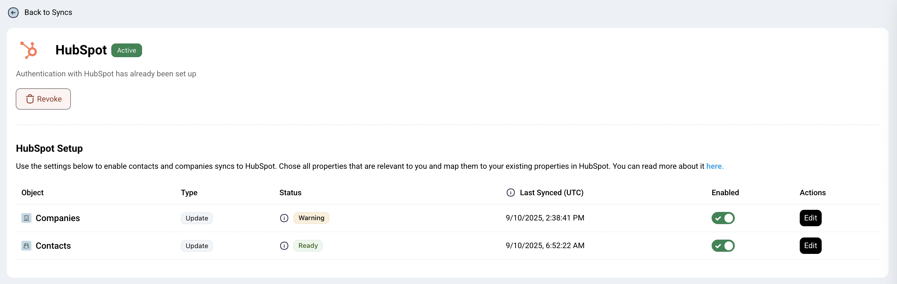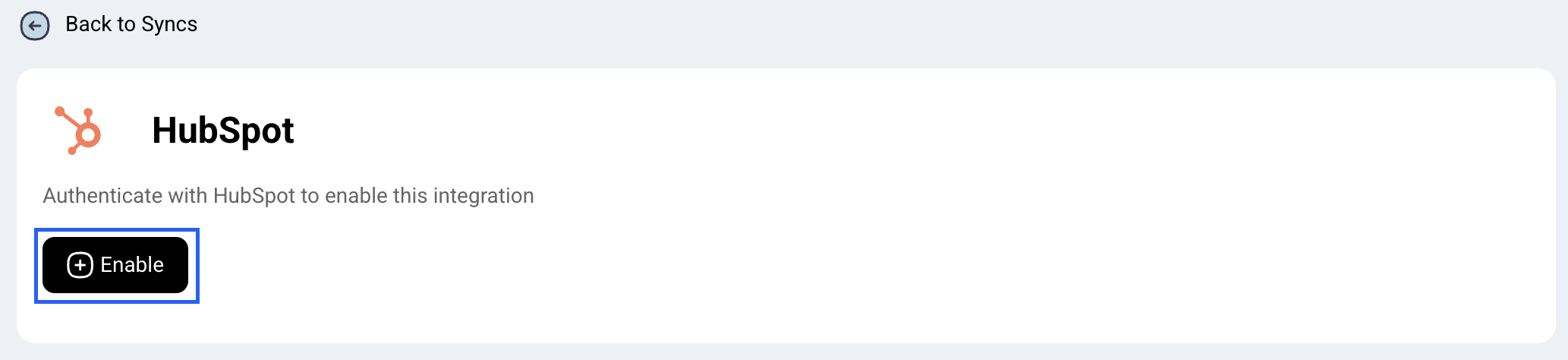 Click the Enable button to connect your HubSpot account. Make sure that the account used has access to edit the relevant properties.