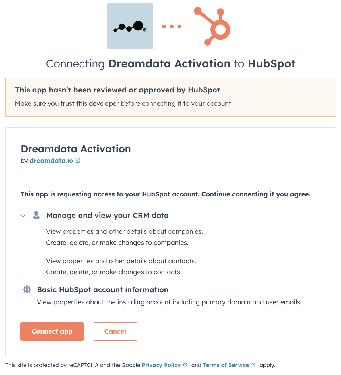 If you aren't already signed in, sign into your HubSpot account, select the account you want to use and connect the Dreamdata Activation App.