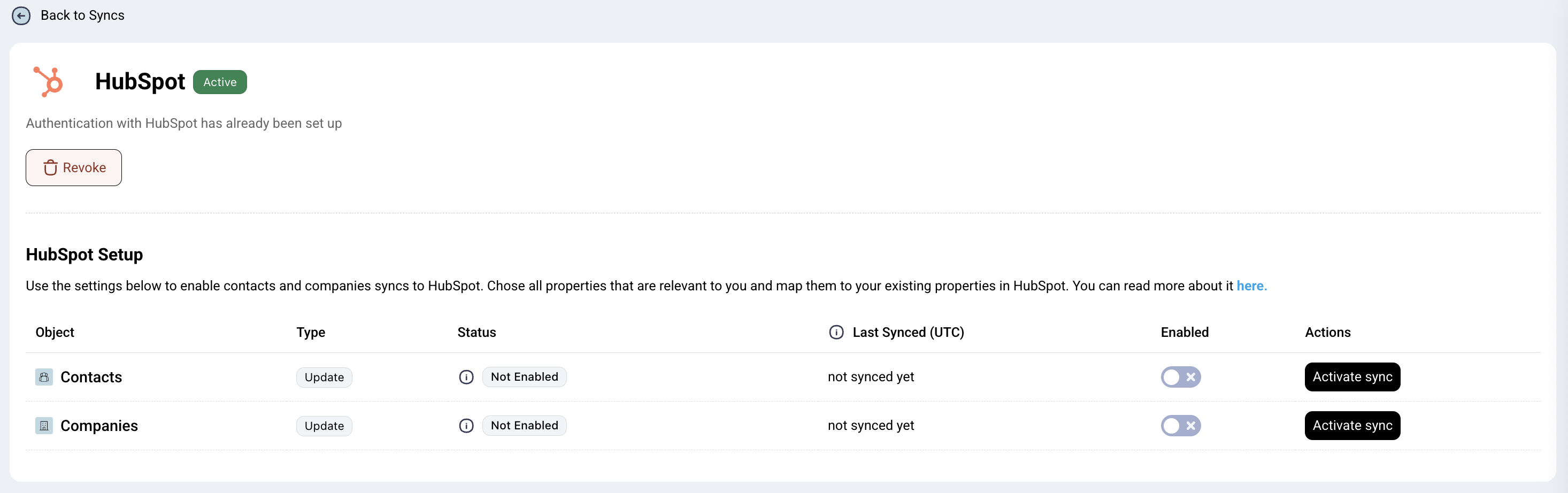 Choose the Object type that you want to sync and activate it - companies, contacts or both. The ID property will be used for matching companies and the email property will be used for matching contacts. The syncs are counted towards your sync limit.