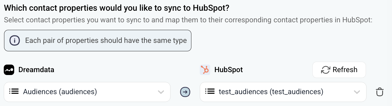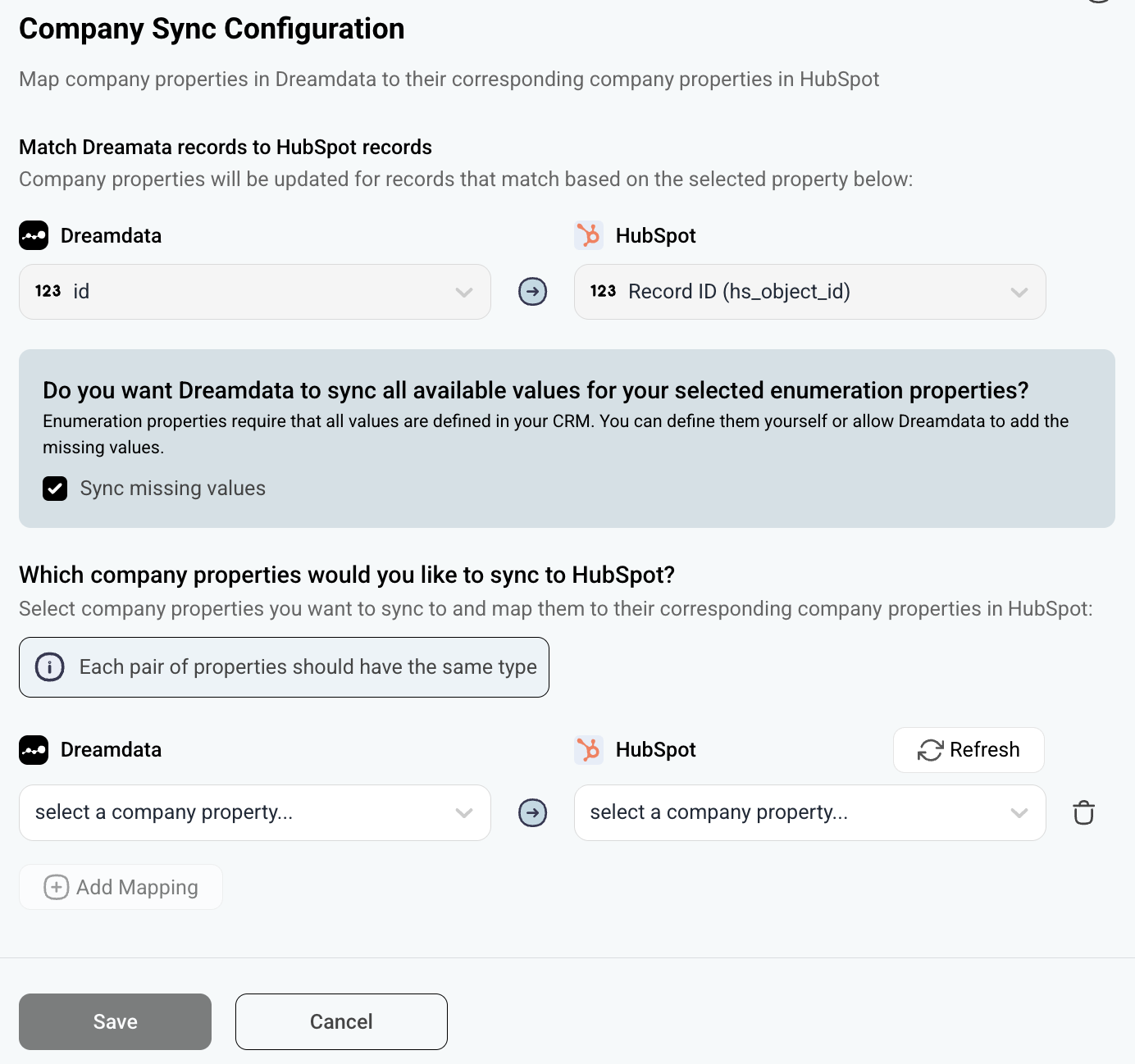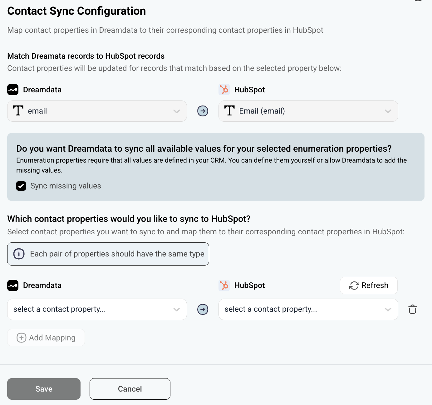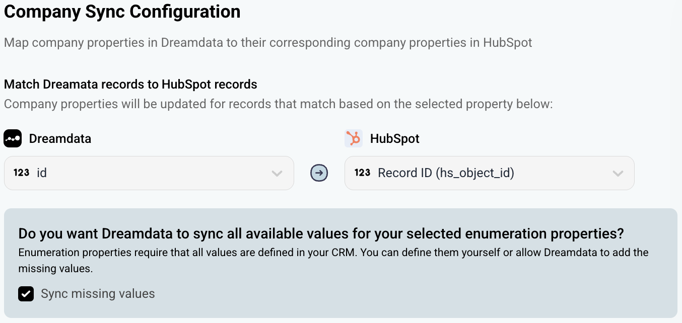 Enable the Sync missing values checkbox available in your configuration if you want to allows Dreamdata to sync all available values into your selected multi-checkbox/enumeration properties (this is required for each sync). This removes the setup work needed in your CRM to define all accepted options. If you do not want to check the Sync missing values checkbox, make sure that the values defined in Dreamdata are also added in HubSpot for each enumeration property (example: all individual signal names have to be defined in HubSpot for the property that will be used to sync signals into).If you add or update properties while doing the configuration in Dreamdatam, click the refresh button to pull the latest information from HubSpot.