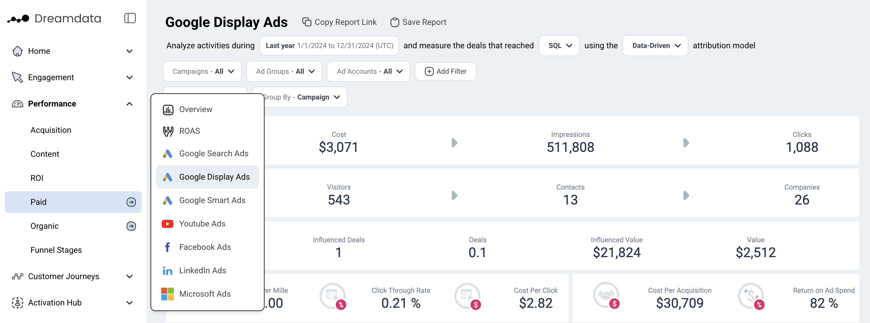 Deals: The number of deals that are associated with Display or Discovery campaigns based on your selected filter